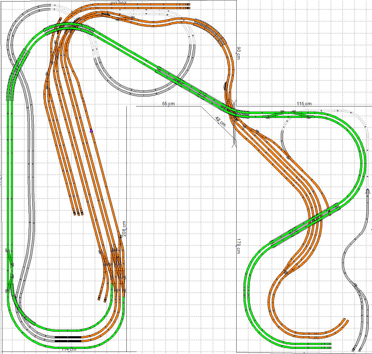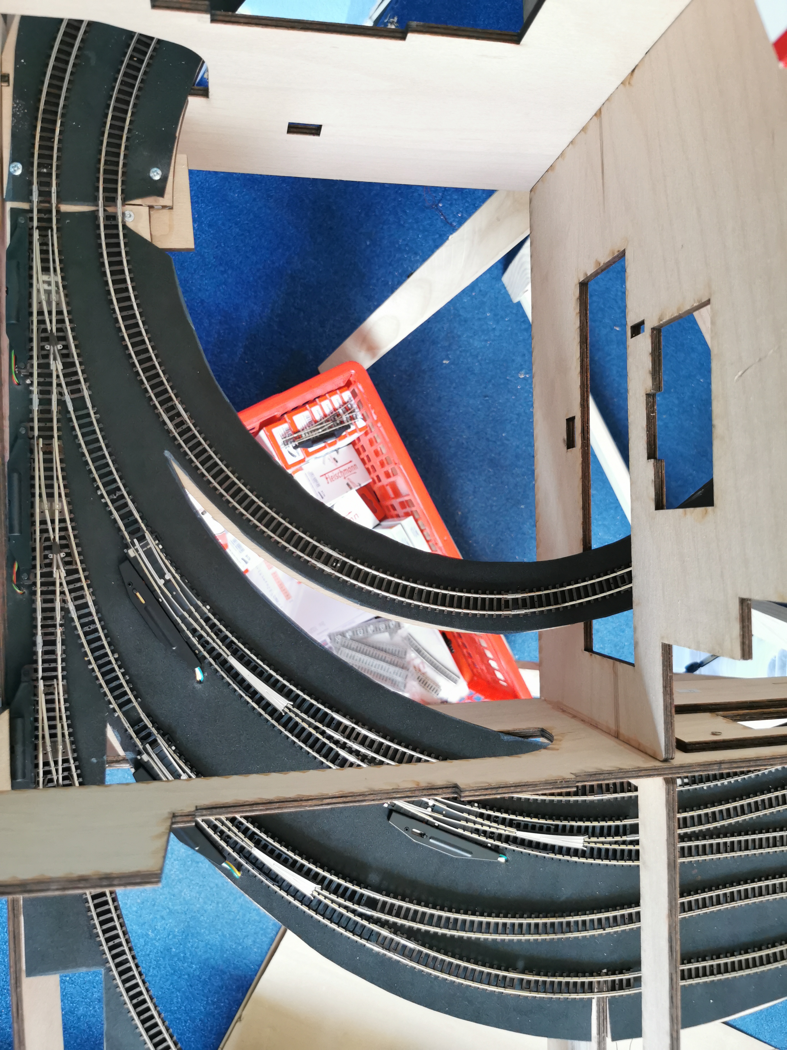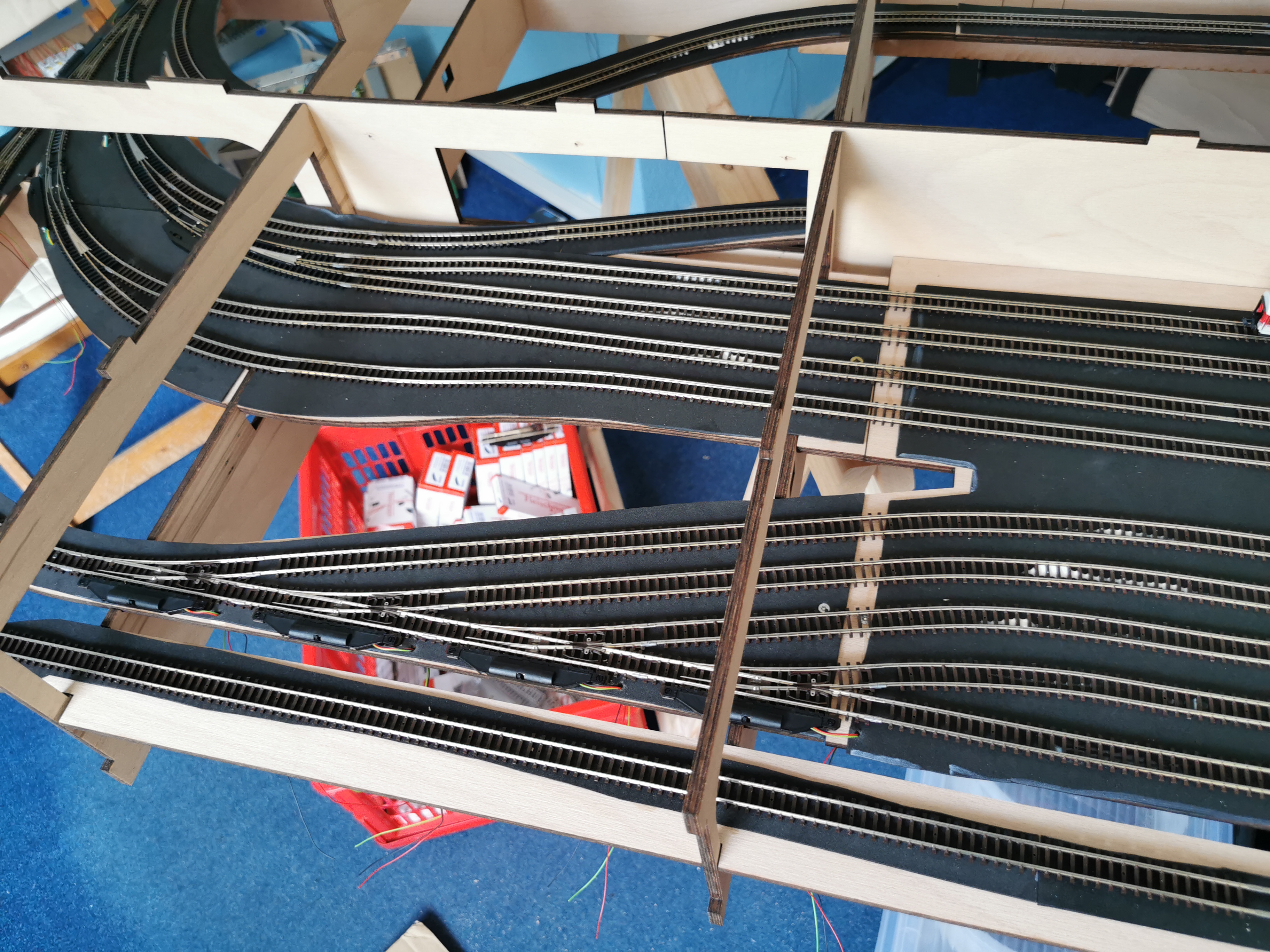 Alle Schienen des Schattenbahnhofs sind verlegt und mit Latexleim auf die Gummimatten aufgeklebt.