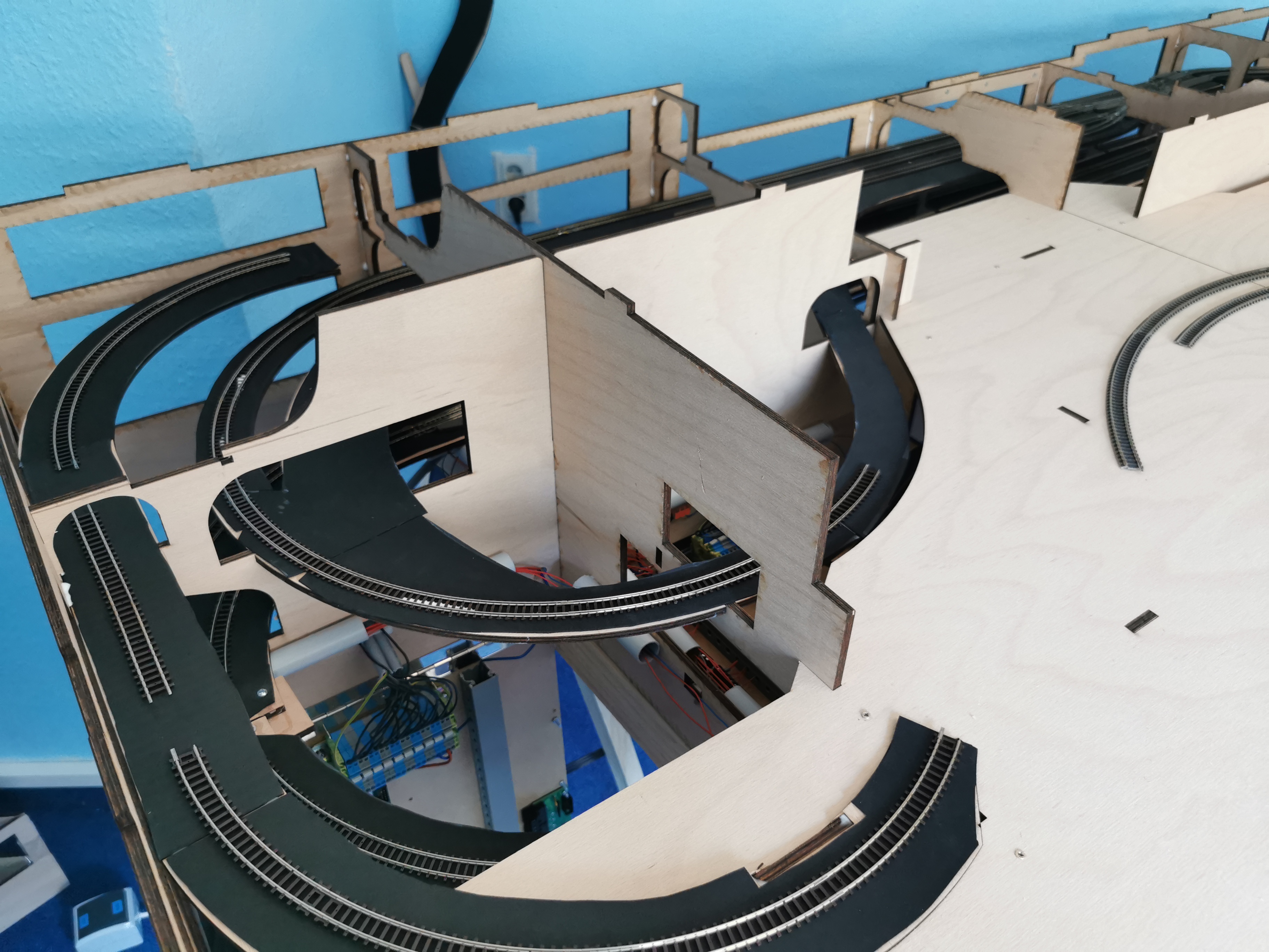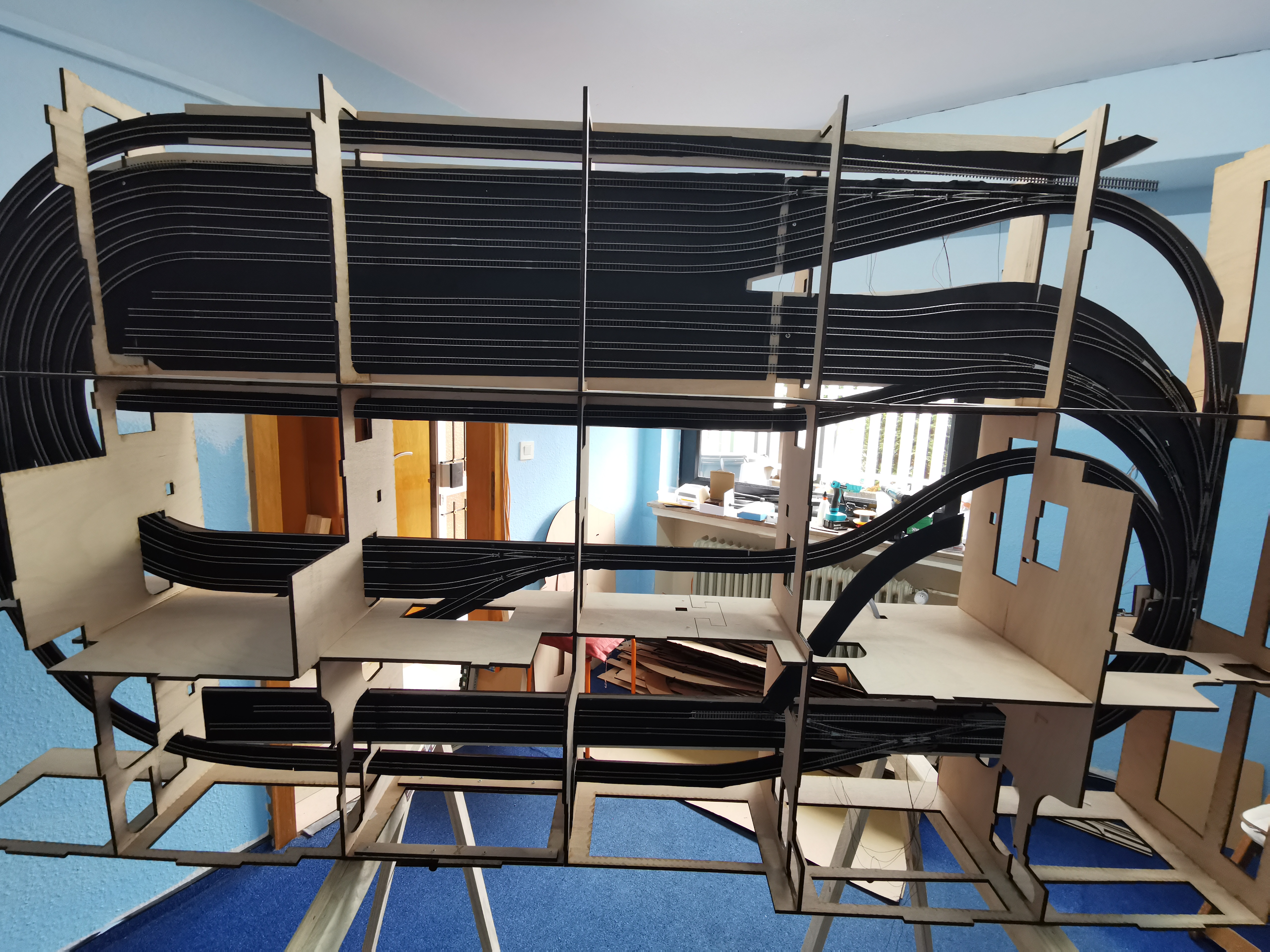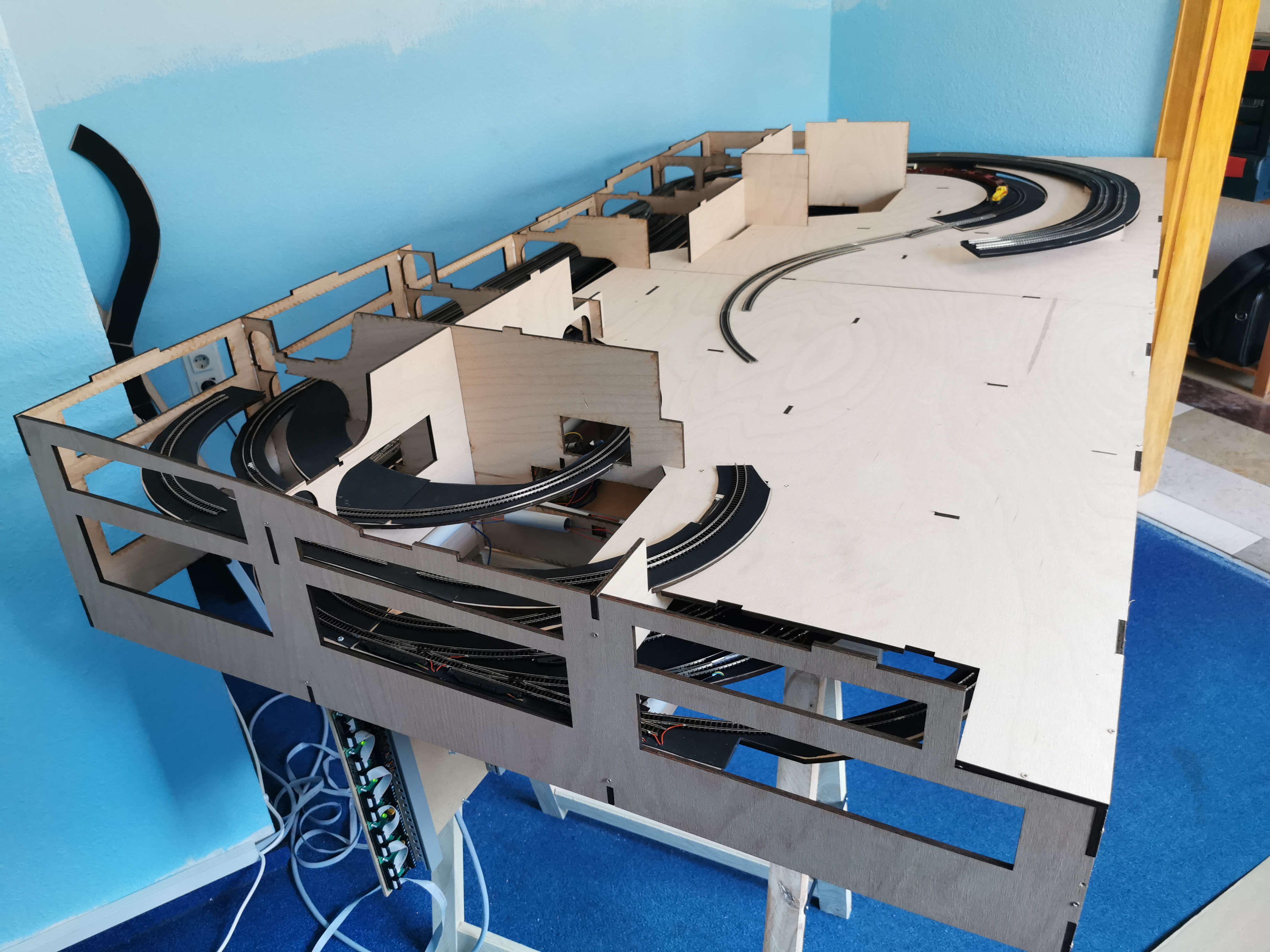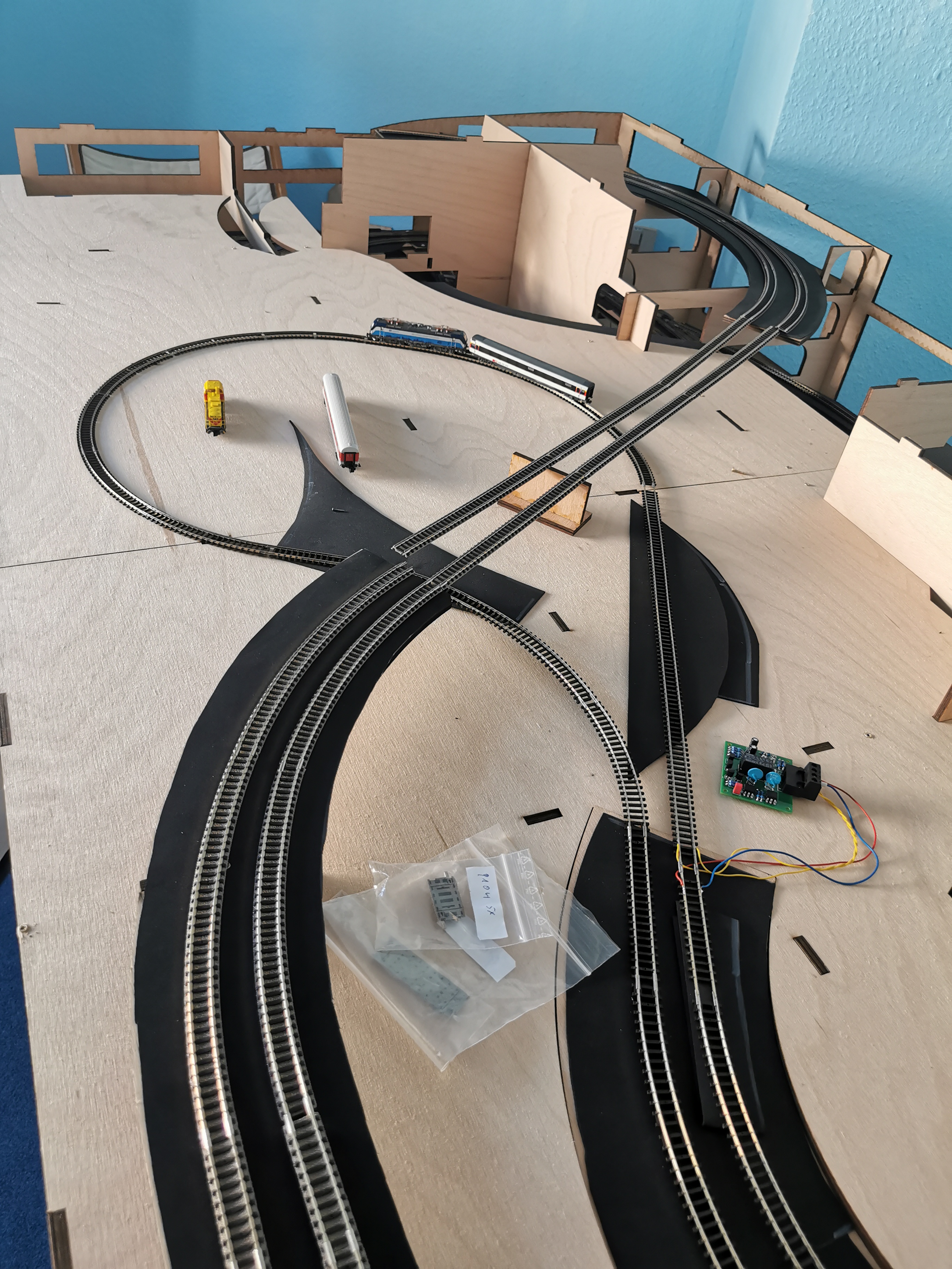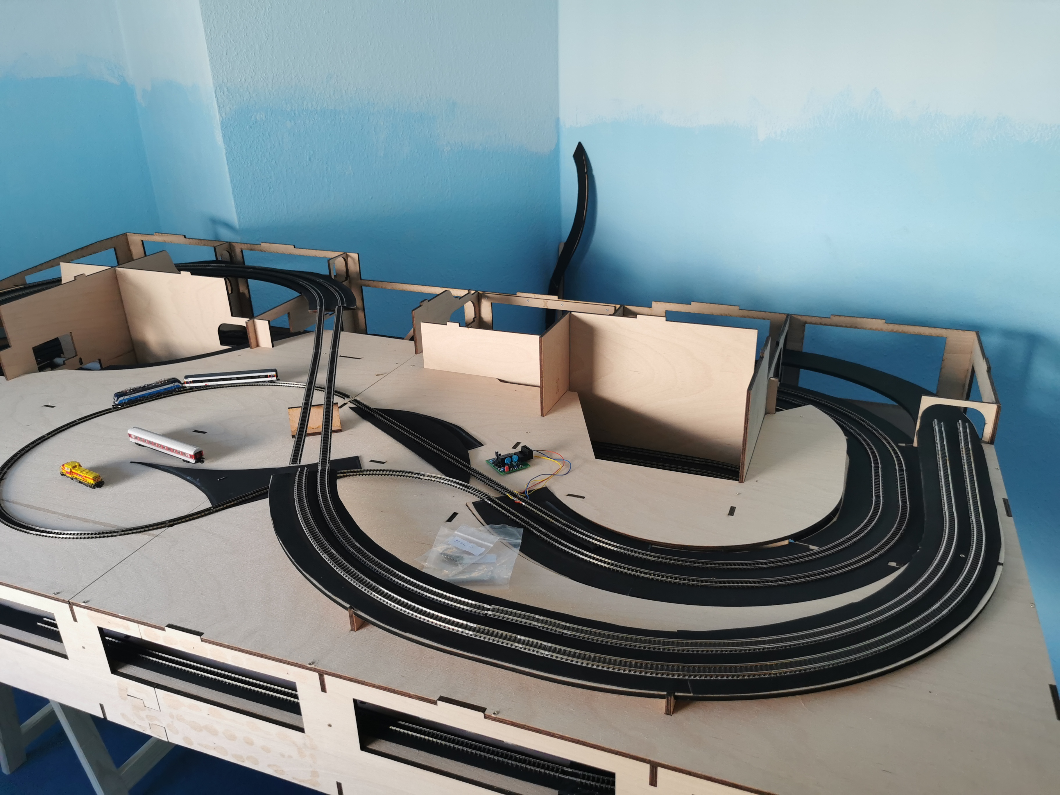Einen Verdrahtungsfehler im Power-Board entdeckt (ein Booster-Channel war vertauscht) Trassenbretter für SFS gelegt