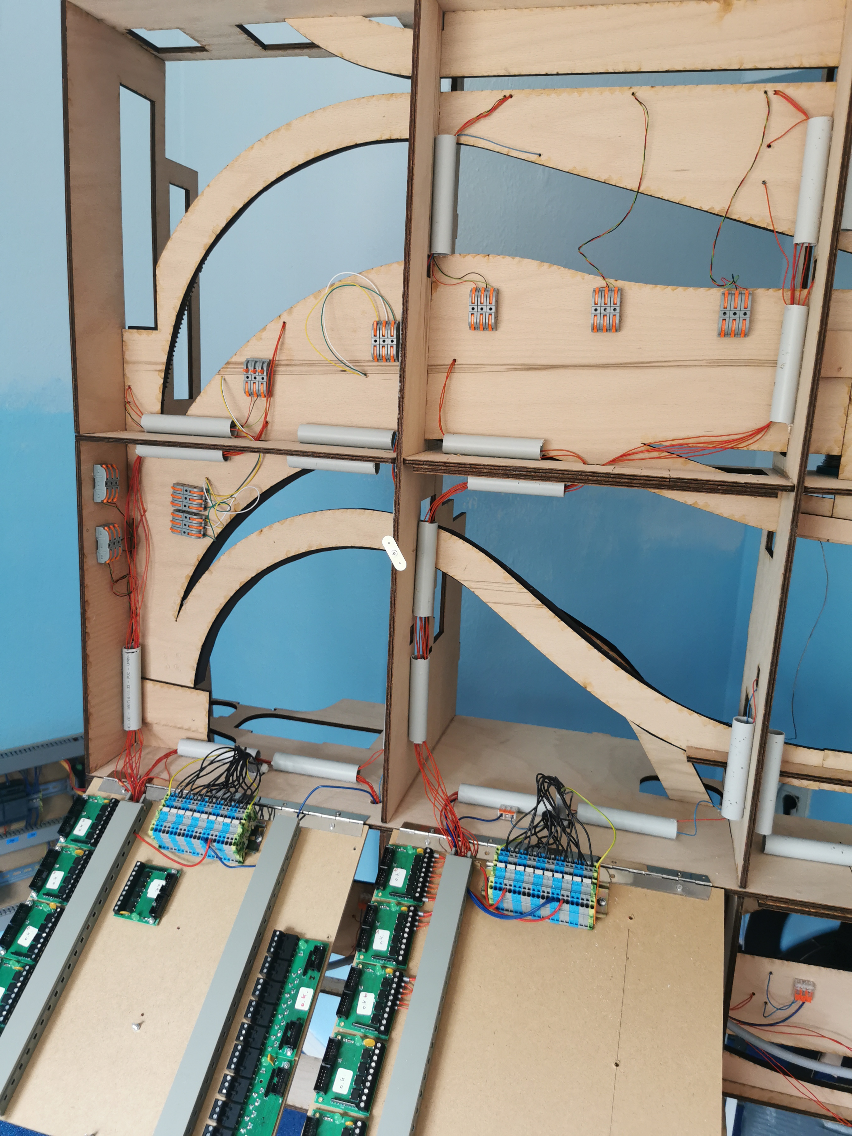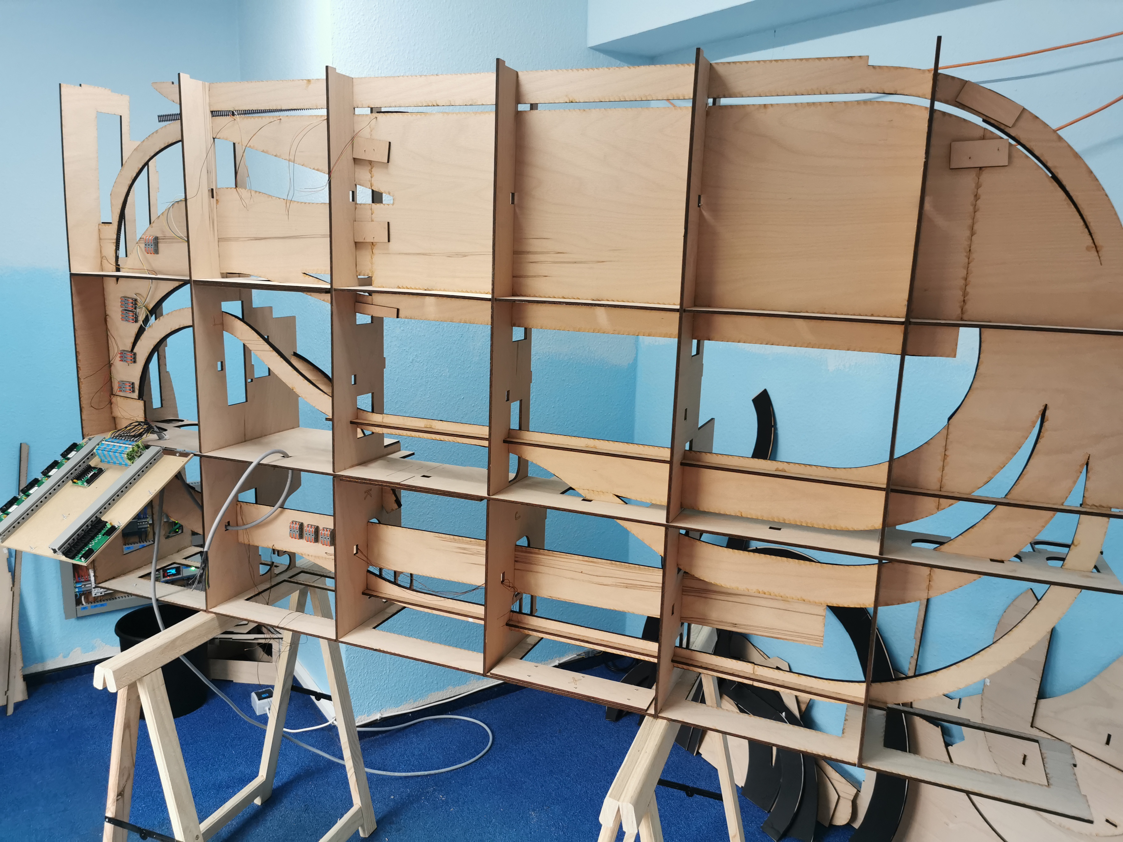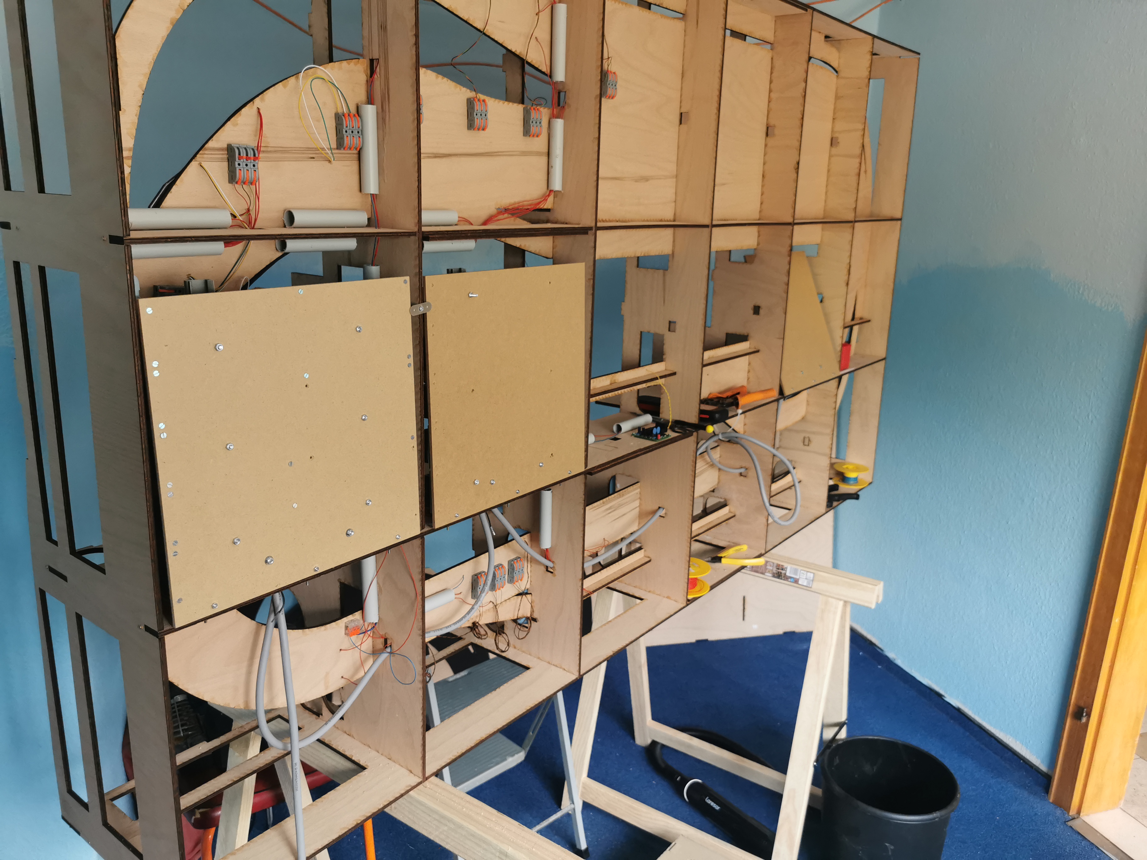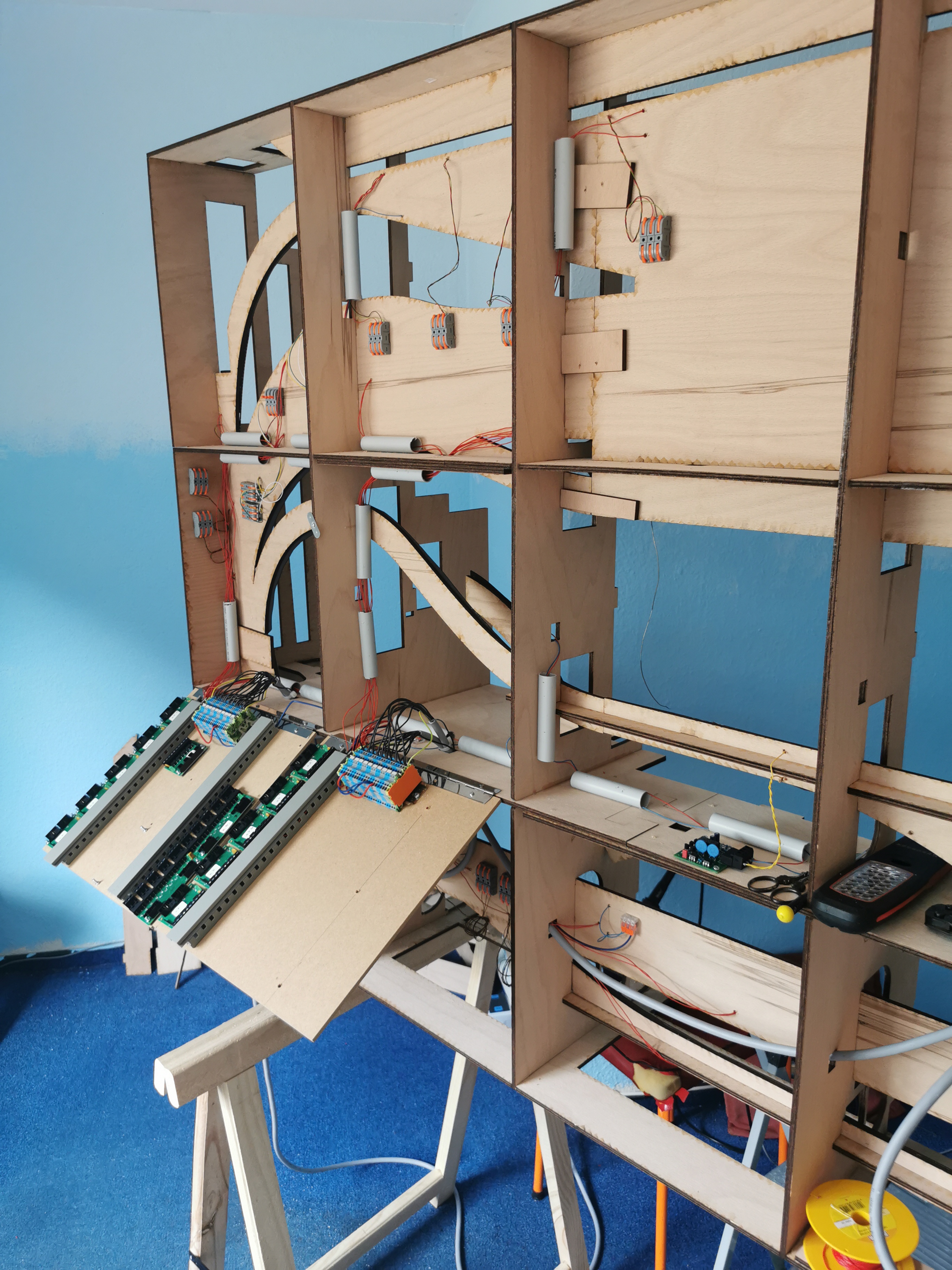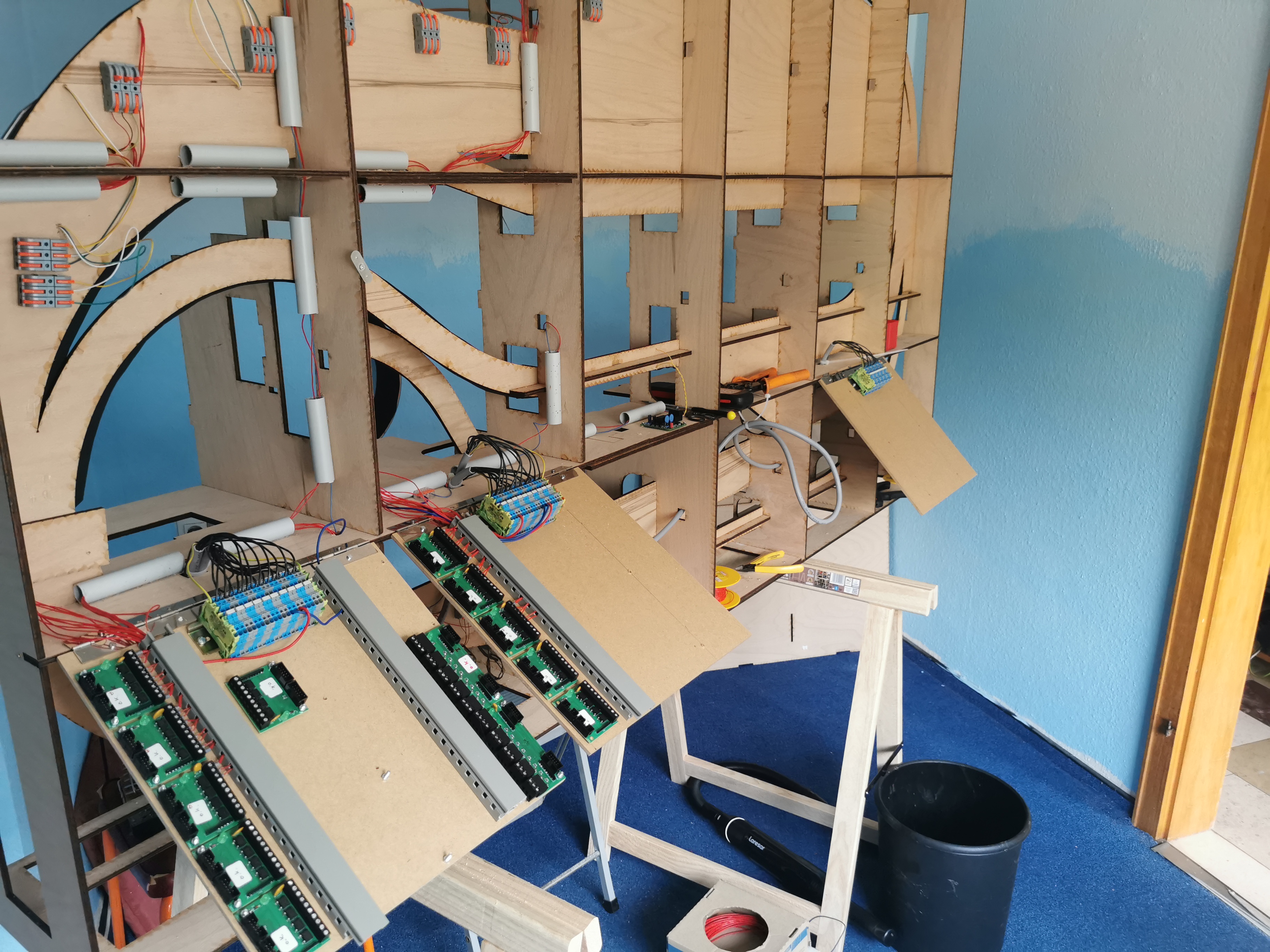 Einen Verdrahtungsfehler im Power-Board entdeckt (ein Booster-Channel war vertauscht) Trassenbretter für SFS gelegt