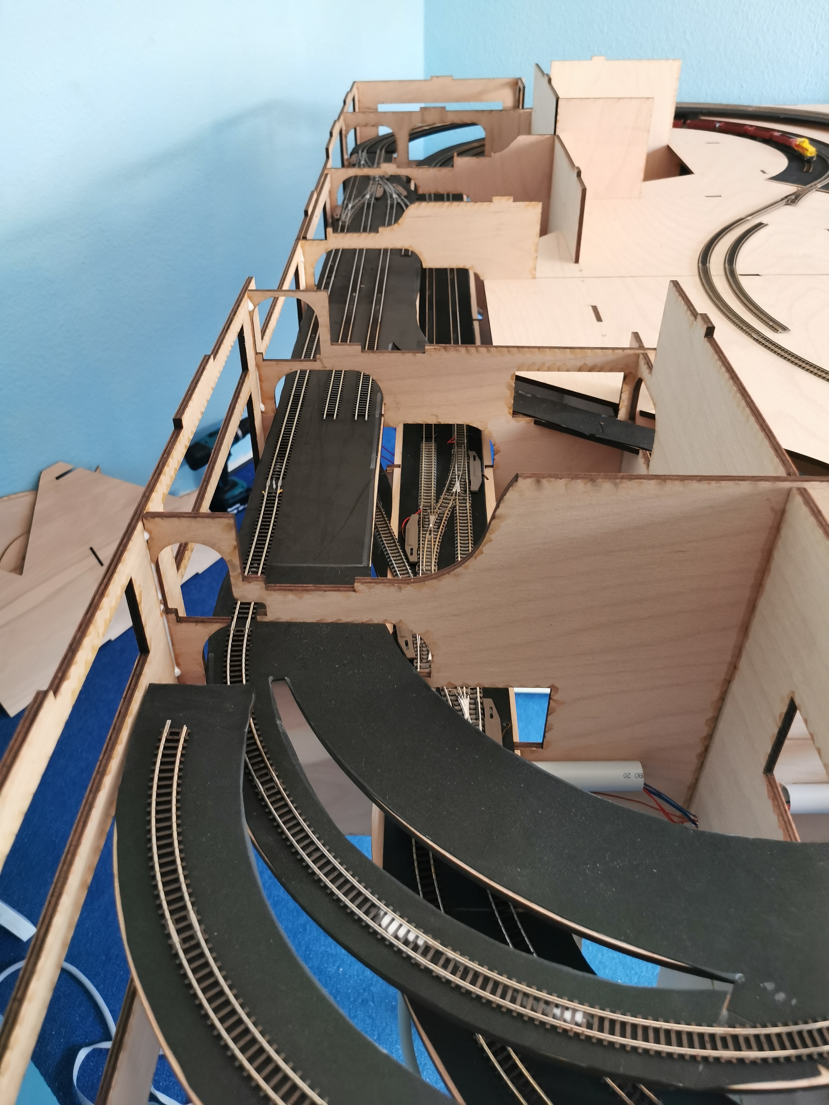 Die untere Ebene (Schattenbahnhof Dinostadt-Süd) ist fertig mit Gummimatten (1mm Stärke) beklebt und alle Trassenbretter sind eingebaut.